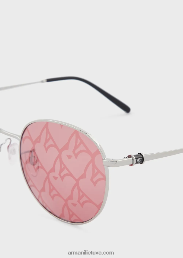 apvalūs, dideli metaliniai akiniai nuo saulės, puošti reljefiniu emalio logotipu ant smilkinių.