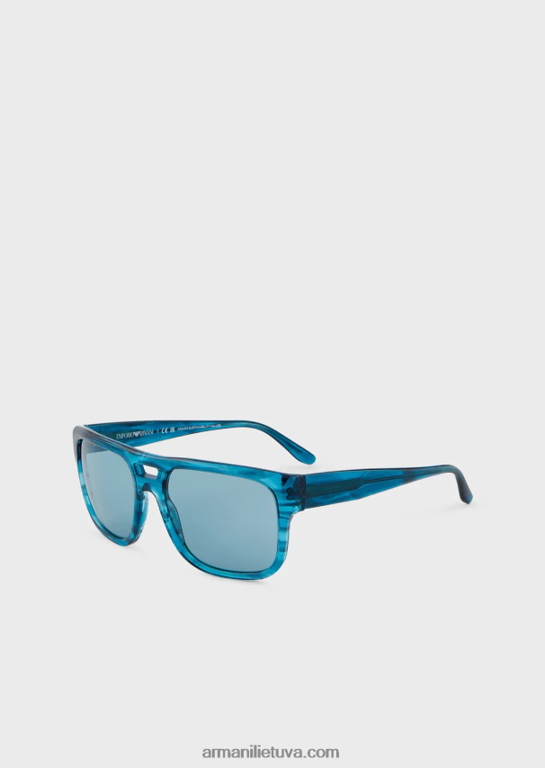 Vyriški akiniai nuo saulės su geometriniu siluetu ir ekologiška bioacetato konstrukcija, derančiu dizainu ir tvarumu. dvigubo tilto konstrukcija su skaidriomis detalėmis ir atspausdintu emporio armani logotipu.