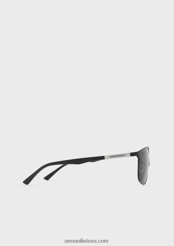 Atletiško stiliaus vyriški akiniai nuo saulės ant šiek tiek apgaubiančios ir ekologiškos konstrukcijos iš metalo ir aliuminio. kontūrinės smilgos ir šoninis logotipas ant šventyklos su aliuminio detalėmis.