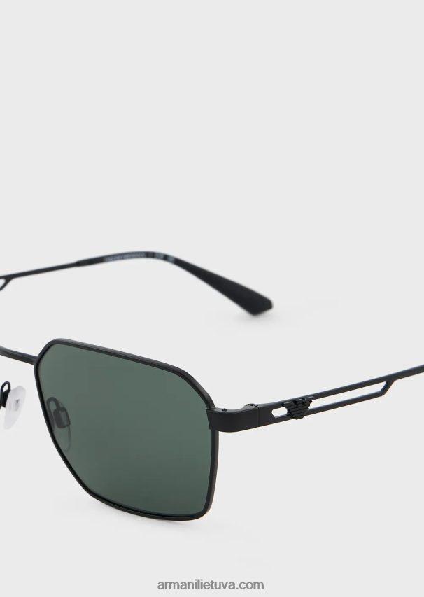 geometrinio dizaino vyriški akiniai nuo saulės ant metalinės konstrukcijos. Konstrukcija su metalinėmis nosies pagalvėlėmis, kad būtų patogiau, plokščios kojos su dekoratyvine anga ir įspaustas erelio logotipas.