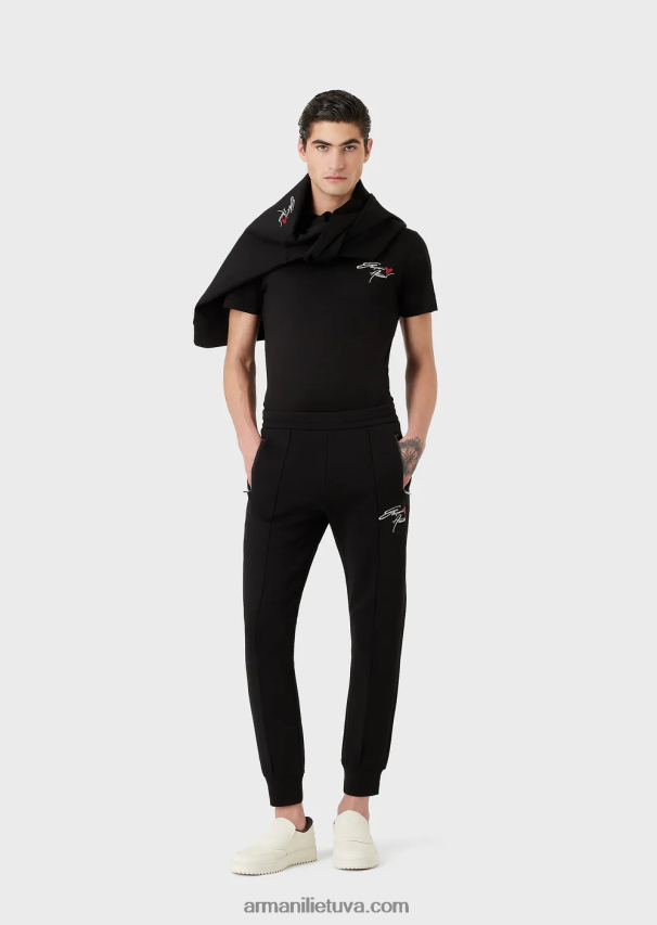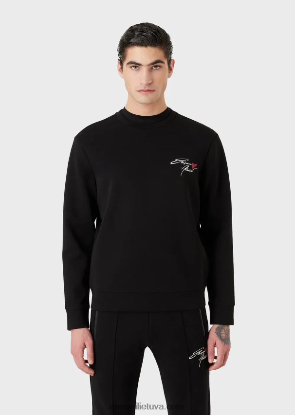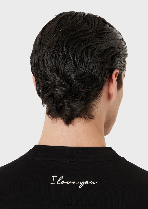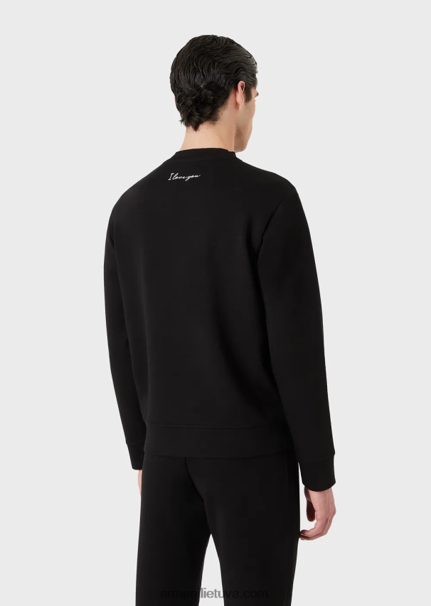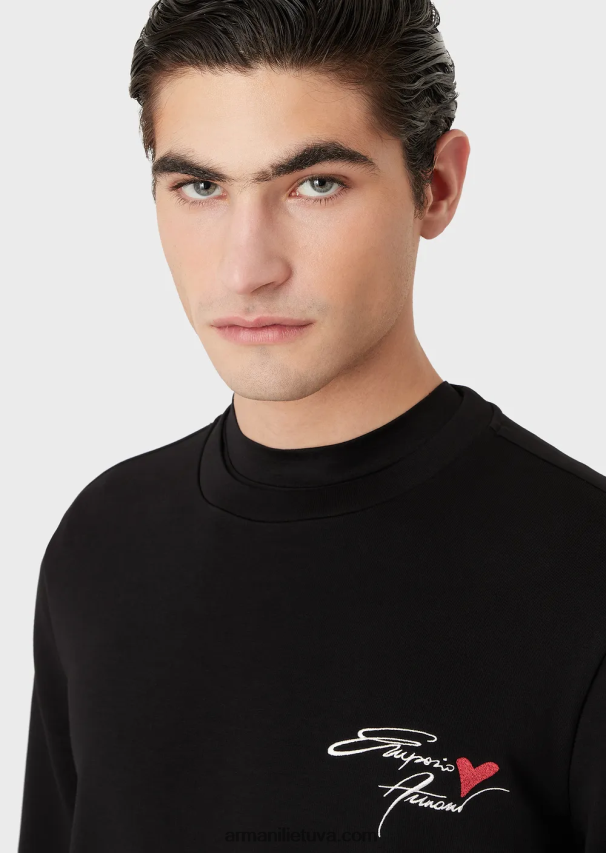 duoklė meilės ir įsimylėjėlių dienai: teminiai siuvinėjimai, spaudiniai ir aplikacijos puošia gatavus drabužius ir aksesuarus, skirtus Valentino dienos kapsulių kolekcijai, emporio armani kolekcijai, kuri švenčia meilę. Įprasto kirpimo megztinis iš dvigubo megztinio, dekoruotas kontrastingais siuvinėjimais su firminiu logotipu ant krūtinės ir užrašu „aš tave myliu“ nugaroje.