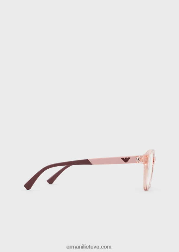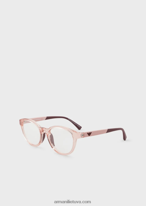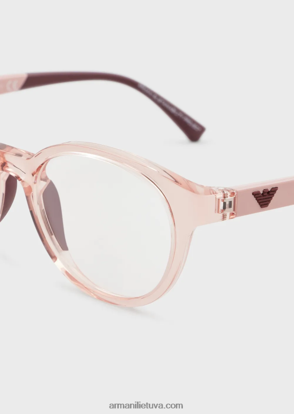 Ekologiški apvalūs mergaičių akiniai, pagaminti iš itin lengvo bionailono pluošto. šventyklos su guminiais antgaliais ir atitinkamu guminiu erelio logotipu. armani tvarumo projekto logotipas šventyklos viduje.