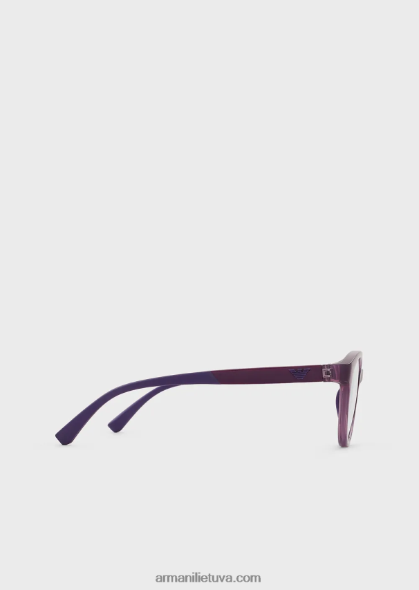 Ekologiški apvalūs mergaičių akiniai, pagaminti iš itin lengvo bionailono pluošto. šventyklos su guminiais antgaliais ir atitinkamu guminiu erelio logotipu. armani tvarumo projekto logotipas šventyklos viduje.