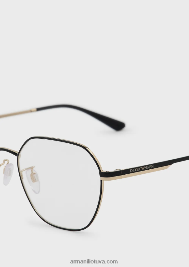 modernūs moteriški akiniai ant metalinio rėmelio. geometrinė konstrukcija su nosies pagalvėlėmis su metaliniais pagrindais, kad būtų patogiau, ir smilkinius, papuoštus lazeriu iškirptu emporio armani logotipu. azija tinka.