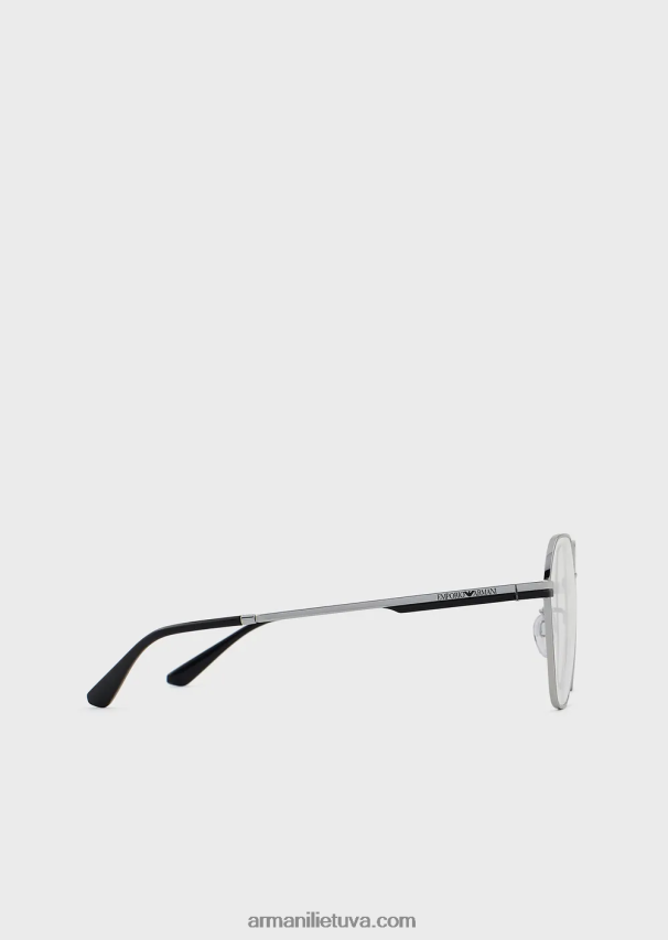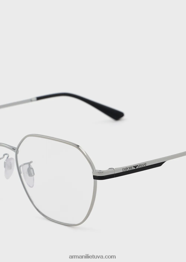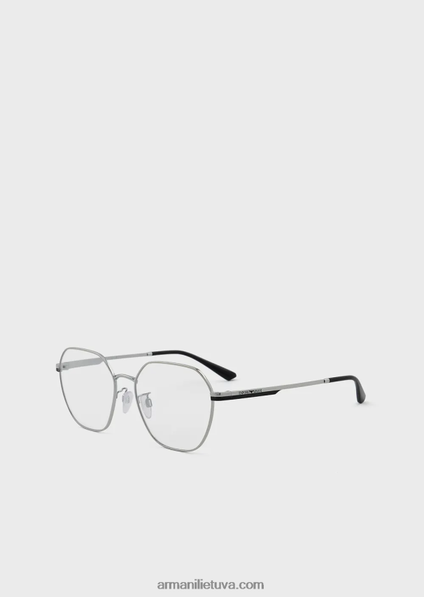 modernūs moteriški akiniai ant metalinio rėmelio. geometrinė konstrukcija su nosies pagalvėlėmis su metaliniais pagrindais, kad būtų patogiau, ir smilkinius, papuoštus lazeriu iškirptu emporio armani logotipu. azija tinka.