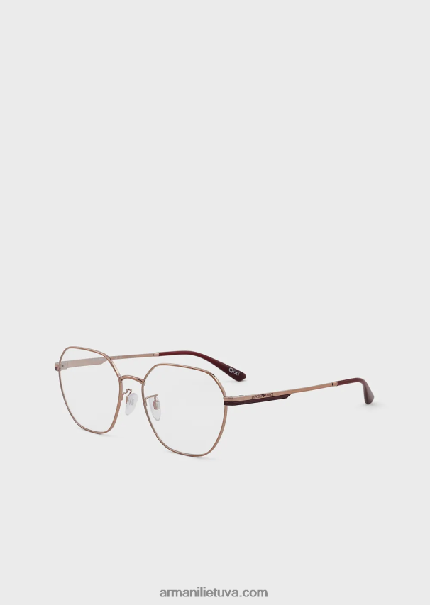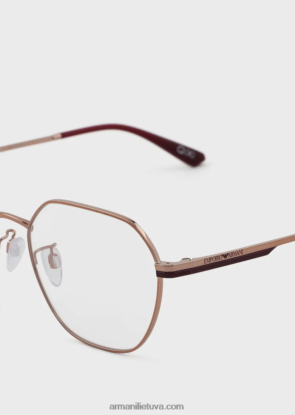 modernūs moteriški akiniai ant metalinio rėmelio. geometrinė konstrukcija su nosies pagalvėlėmis su metaliniais pagrindais, kad būtų patogiau, ir smilkinius, papuoštus lazeriu iškirptu emporio armani logotipu. azija tinka.