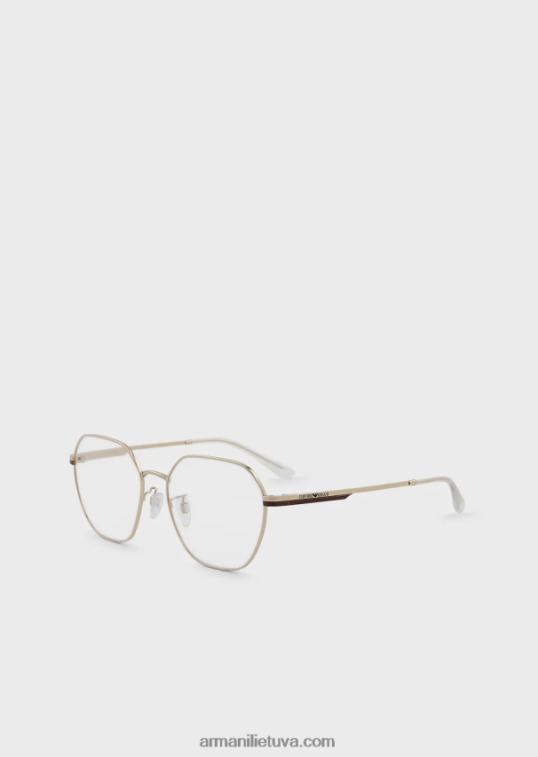 modernūs moteriški akiniai ant metalinio rėmelio. geometrinė konstrukcija su nosies pagalvėlėmis su metaliniais pagrindais, kad būtų patogiau, ir smilkinius, papuoštus lazeriu iškirptu emporio armani logotipu. azija tinka.
