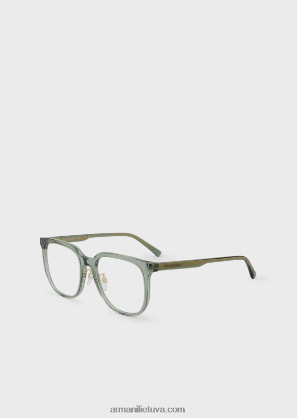 dideli kvadratiniai akiniai vyrams ant acetato rėmo. metalinė šerdis, nosies pagalvėlės su metaliniais pagrindais, kad būtų patogiau, ir smilkiniai, papuošti lazeriu iškirptu emporio armani logotipu.