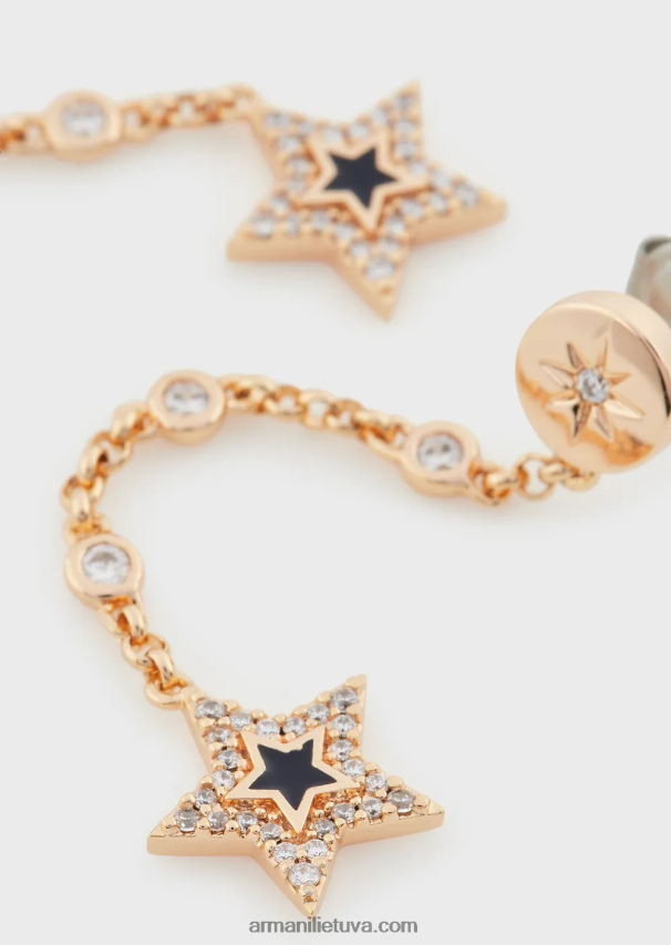 nuleidžiami auskarai su paaukštintu rožinio aukso atspalviu padengtu žalvariu, mėlynu laku, skaidriais kristalais ir užsegimais.
