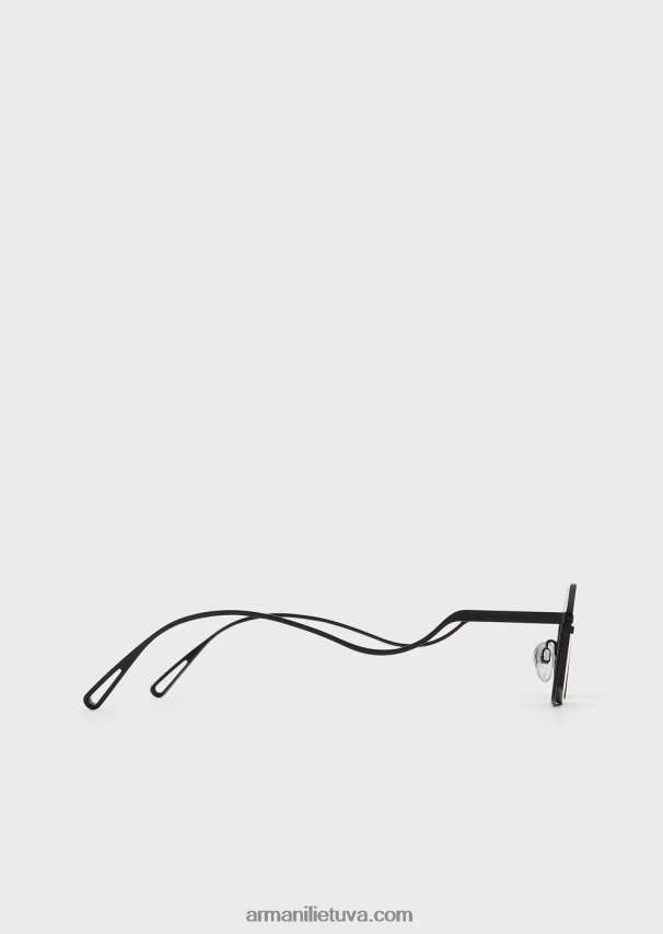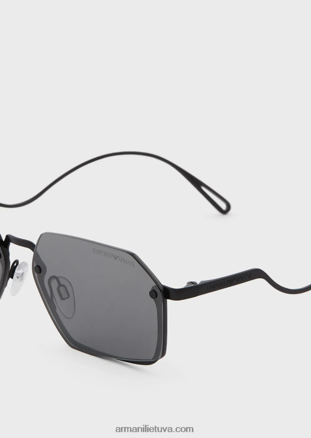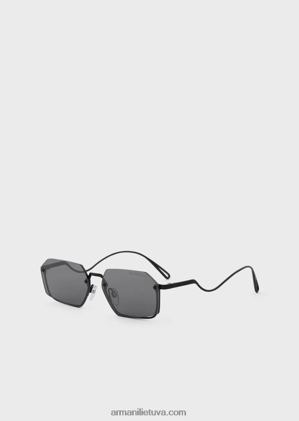 stačiakampiai akiniai nuo saulės su metaline konstrukcija ir be viršutinio rėmelio. unikalios banguotos šventyklos su išgraviruotu logotipu.