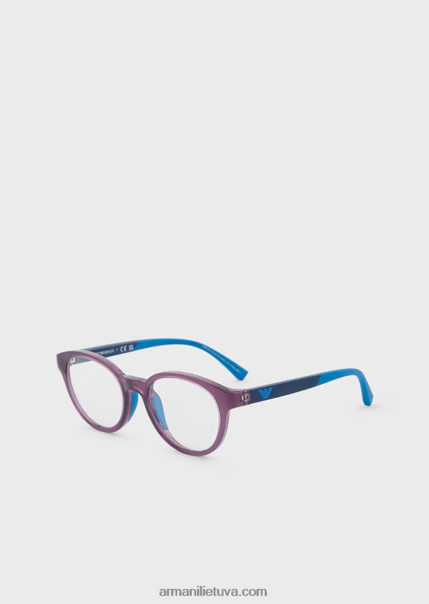 Ekologiški apvalūs mergaičių akiniai, pagaminti iš itin lengvo bionailono pluošto. šventyklos su guminiais antgaliais ir atitinkamu guminiu erelio logotipu. armani tvarumo projekto logotipas šventyklos viduje.